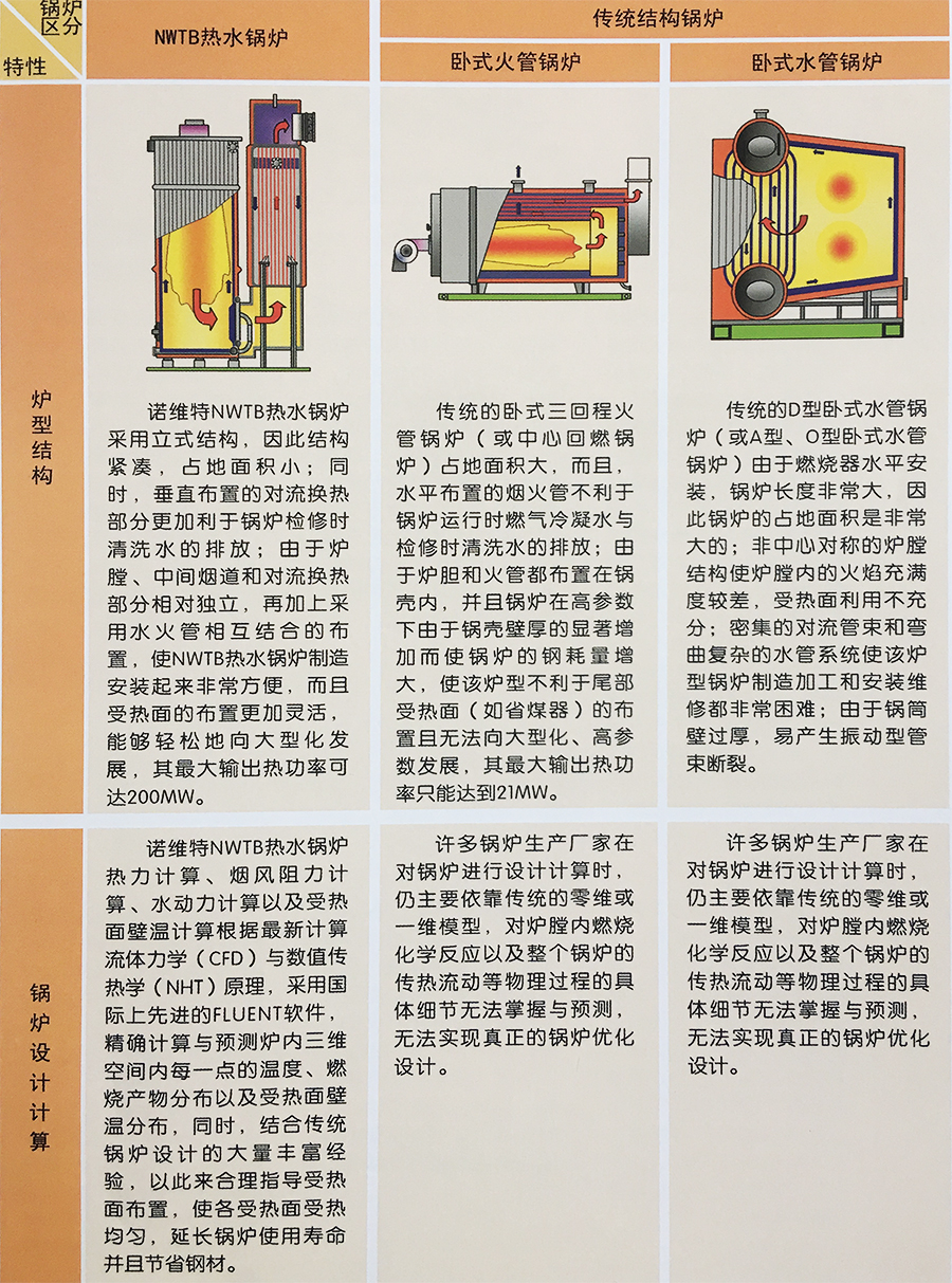 • 在七十年代以前,芬兰大型燃气或油热水锅炉的尾部对流受热面也采用水管蛇形管束的结构,这种传统的结构是在蒸汽锅炉设计的基础上改造而成的。结果运行中发现,这种结构的管子极易被腐蚀,无论采用何种措施都无法从根本上减轻或避免腐蚀现象的发生,因此开发一种专门为热水锅炉设计的新型的结构,根本解决低温腐蚀现象迫在眉睫。通过大量研究,芬兰诺维特的创始人开发了NWTB型热水锅炉,颠覆了传统的由燃煤蒸汽锅炉改造成的热水锅炉的结构,而其中垂直布置的尾部对流火管受热面从根本上解决了低温腐蚀的现象。
